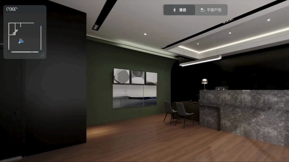 空間以深色調為基底,搭配黑與灰大理石,呈現沉穩大器感。木質地坪與金屬元素交織,強化層次與質感。接待區以明亮燈光襯托空間格局,營造尊貴氛圍。整體設計結合專業形象與高雅氣度,展現接待中心的精緻風貌。